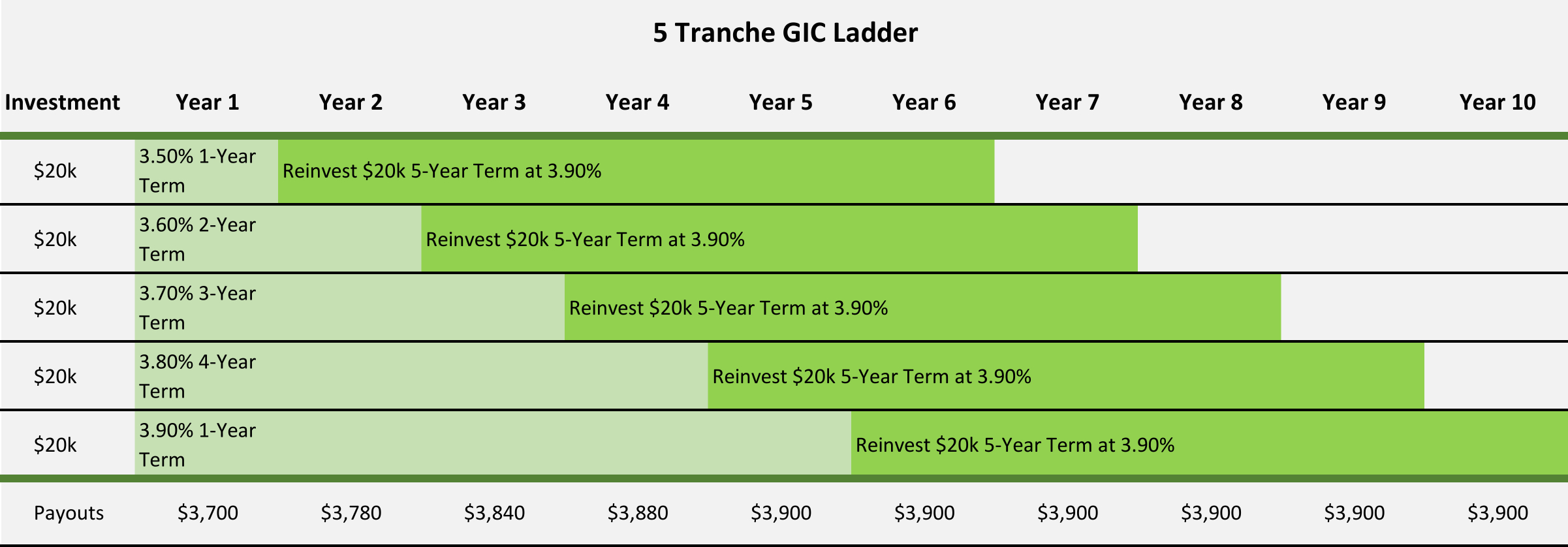 After a year, the 1-year GIC matures and the proceeds are reinvested in a new 5-year GIC. Each year, one GIC matures and is reinvested in a 5-year GIC. Over time, the portfolio becomes a rolling ladder of 5-year GICs, with one maturing every year. If rates rise the maturing GICs can be reinvested at higher rates. If rates fall the existing longer-term GICs preserve higher locked-in rates. This reduces the impact of interest rate cycles.