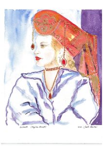 As well as the 10 paintings that comprise Women Who Wear Hats, the series is accompanied by postcard prints of the 10 women in the paintings. The subjects, selected from various eras: Alyce, the Wife of Bath from Geoffrey Chaucer’s Canterbury Tales; Queen Elizabeth 1; Anne Lister of Shibden Hall; Felice Bauer; poet Dorothy Parker; author Vita Sackville West; Angela Garnett; Laura Sheridan; Frida Kahlo; and Adele Huenel. Each of them “had struggled courageously with trauma,” notes Judith, adding that she frequently finds inspiration in literature