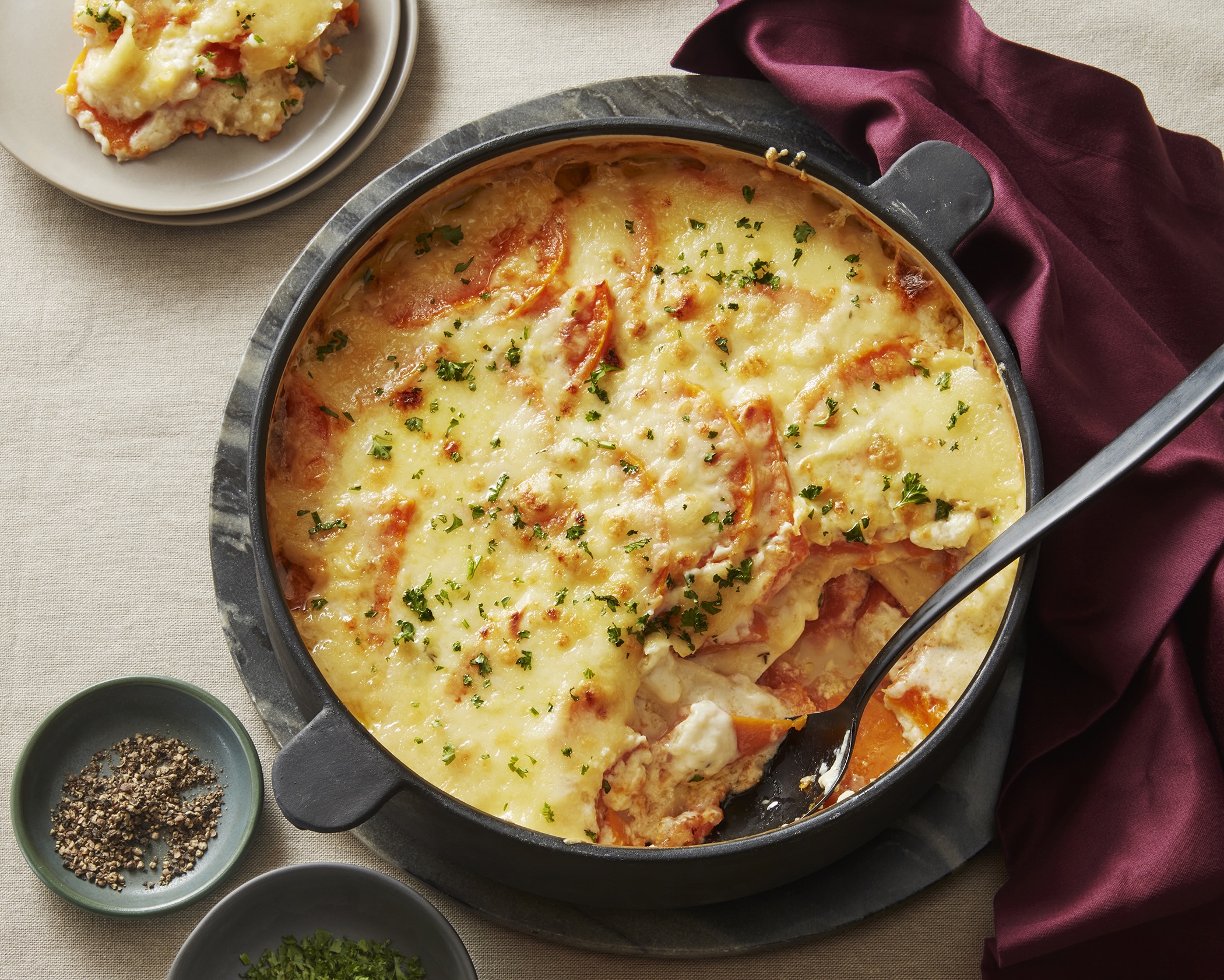In greased 8-cup (2 L) shallow baking dish, layer sweet potatoes; top with one third of the cream sauce and one third of the cheese. Top with parsnips, one third of the sauce and one third of the cheese. Top with squash and remaining sauce.