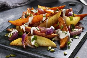 Tuck into spicy Ontario potatoes and sweet potatoes topped with a flavourful Middle Eastern-style dressing. Both potatoes and dressing can be made ahead and assembled before serving. Reheat potatoes or serve at room temperature. This recipe and photo are from Foodland Ontario, foodlandontario.ca Preparation Time: 15 minutes...